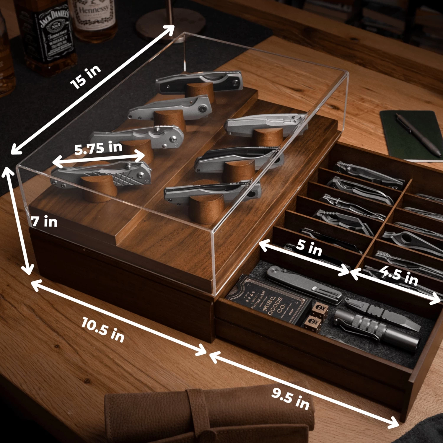 Your pocket knives are uniquely designed, and your knife display should be too. The Armory is designed for your entire knife collection – 7 of them on display under the acrylic cover, and the rest in the felt-lined XL drawer. You can rotate the knives on display at any time to keep things fresh and interesting.