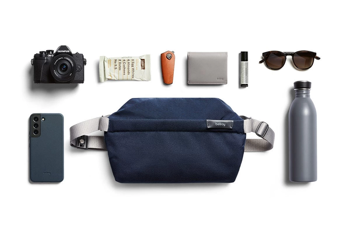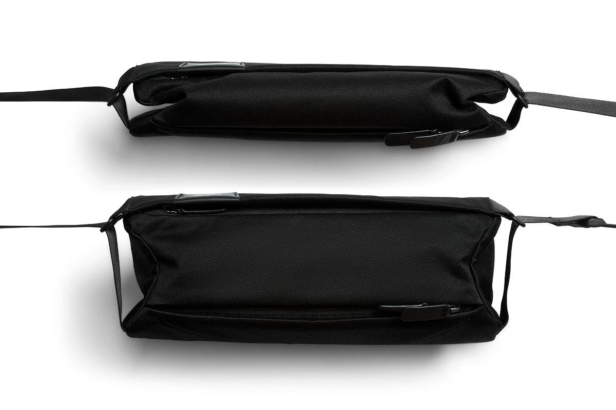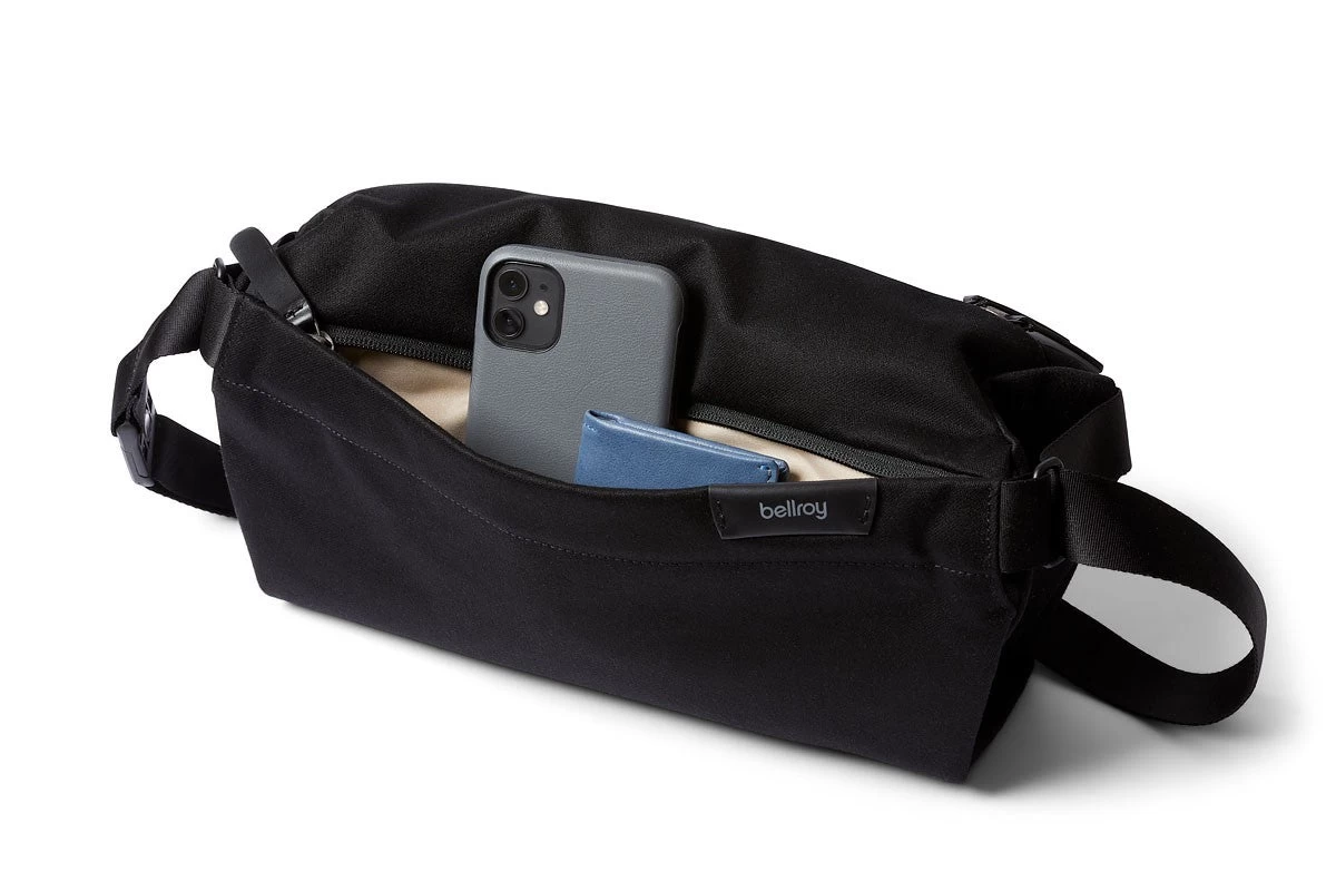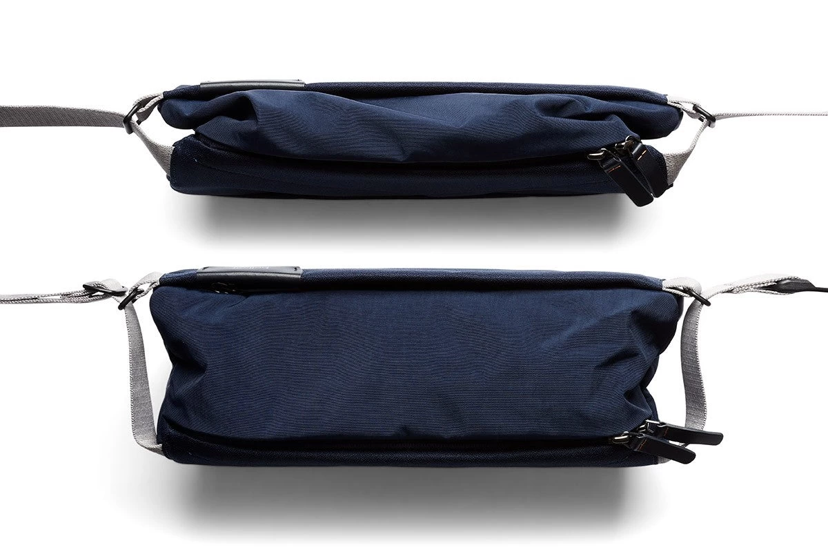 An expandable side gusset grows the bag as you fill it, then self-compress slimmer when going light. You can clip the sling on and off using the magnetic clasp on the strap. The bag can be secured against your front, worn loose across the back, or casually on your shoulder. A centered strap position and two-way zips means this sling is easy to use left-handed, right-handed or ambidextrous.