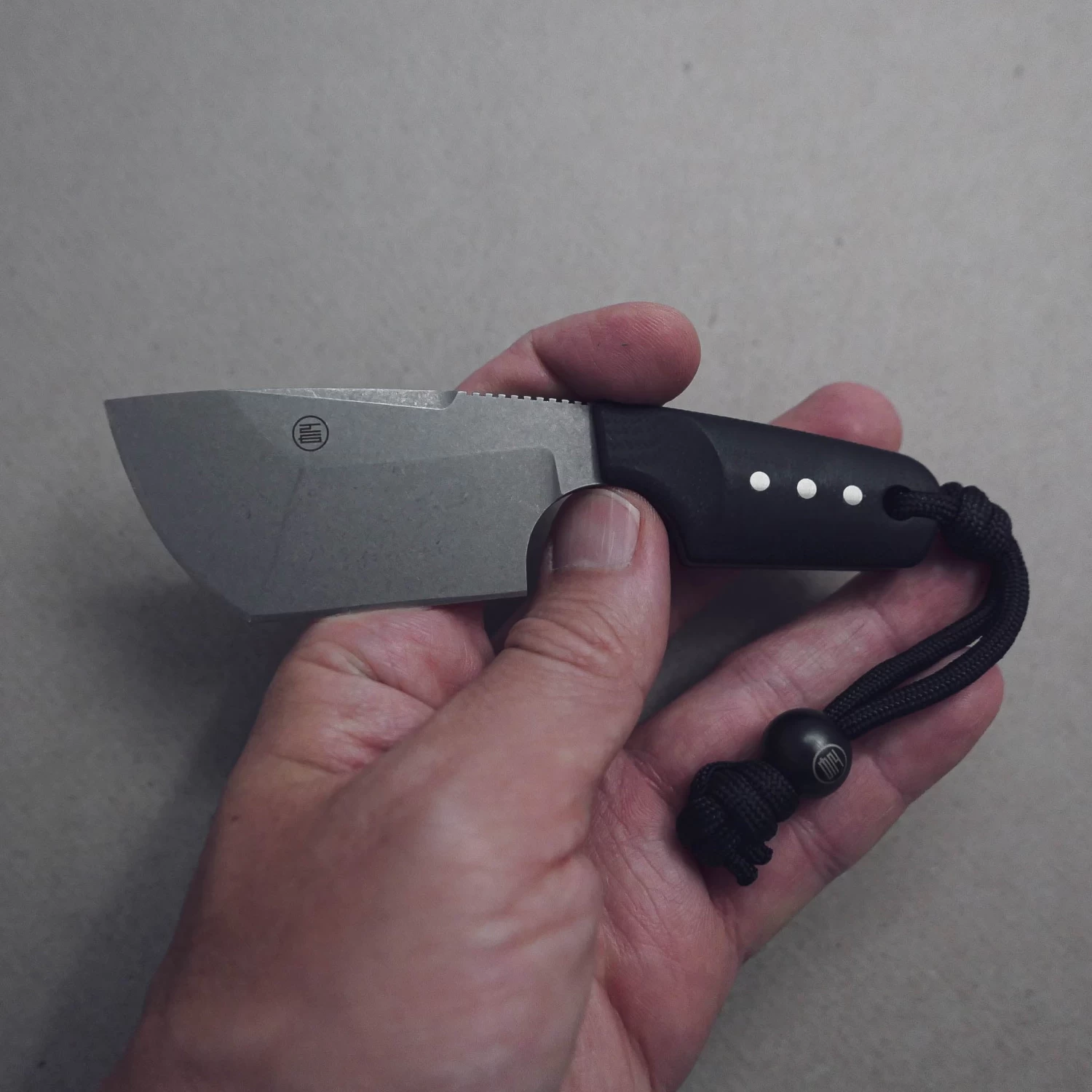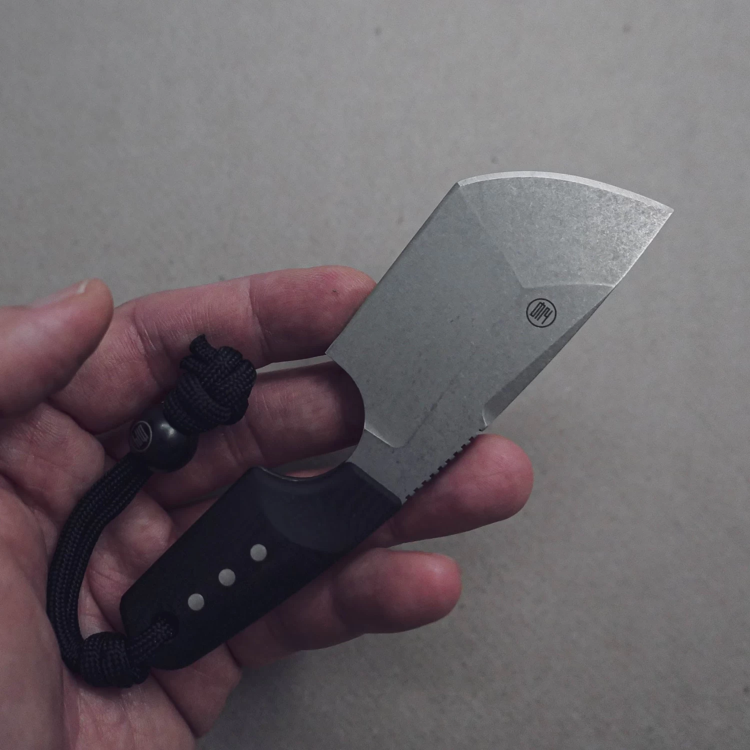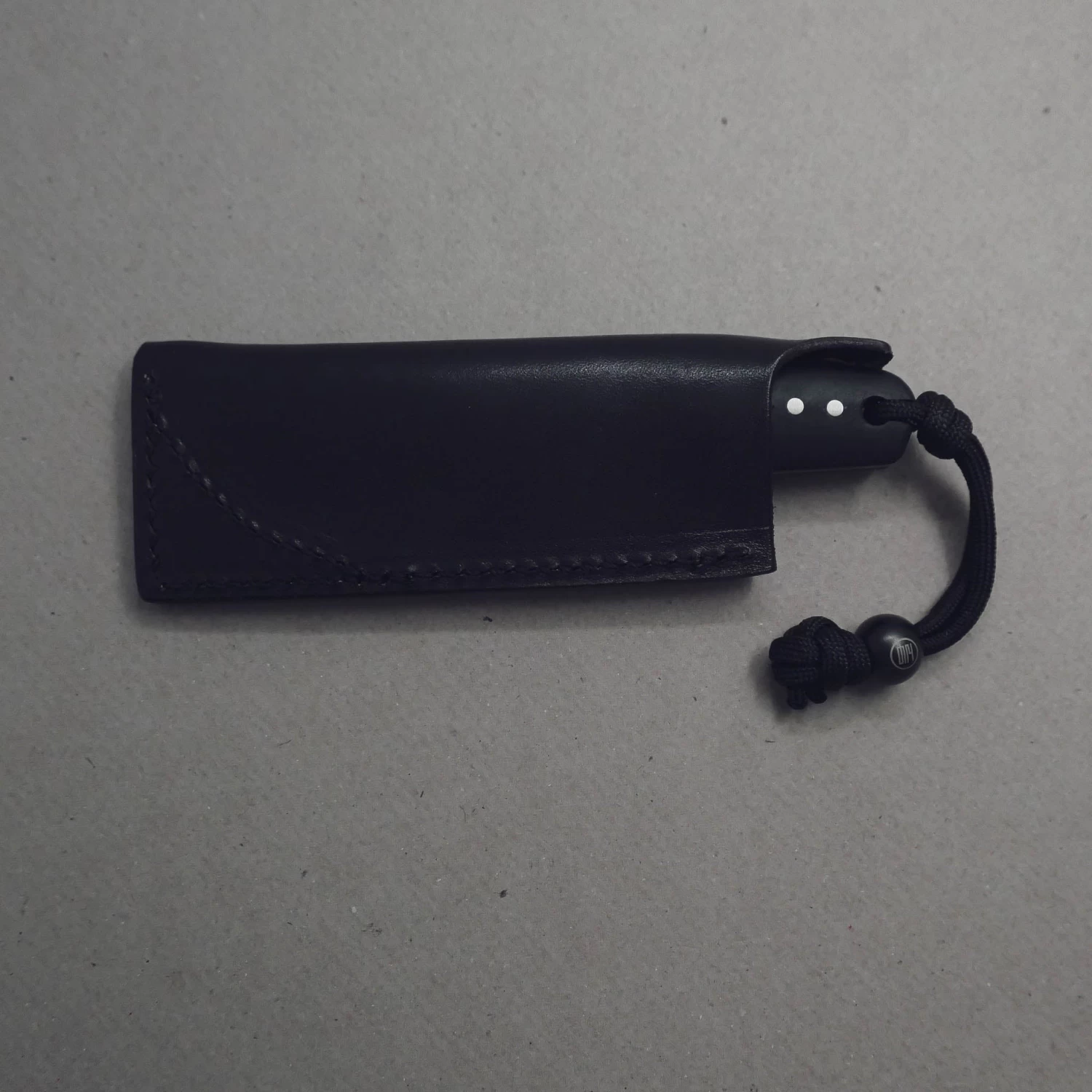 The Blanka is a fixed blade pocket knife with a very secure and comfortable grip that offers lot of control. The profile is unique – a cross between tanto and cleaver, designed to give it more cutting edge. It may be small but it will fulfill most of your cutting needs. Steel inlays in the G10 scales, full tang VG10 beadblast stonewashed blade. Comes with a full leather sheath, paracord lanyard and steel bead.