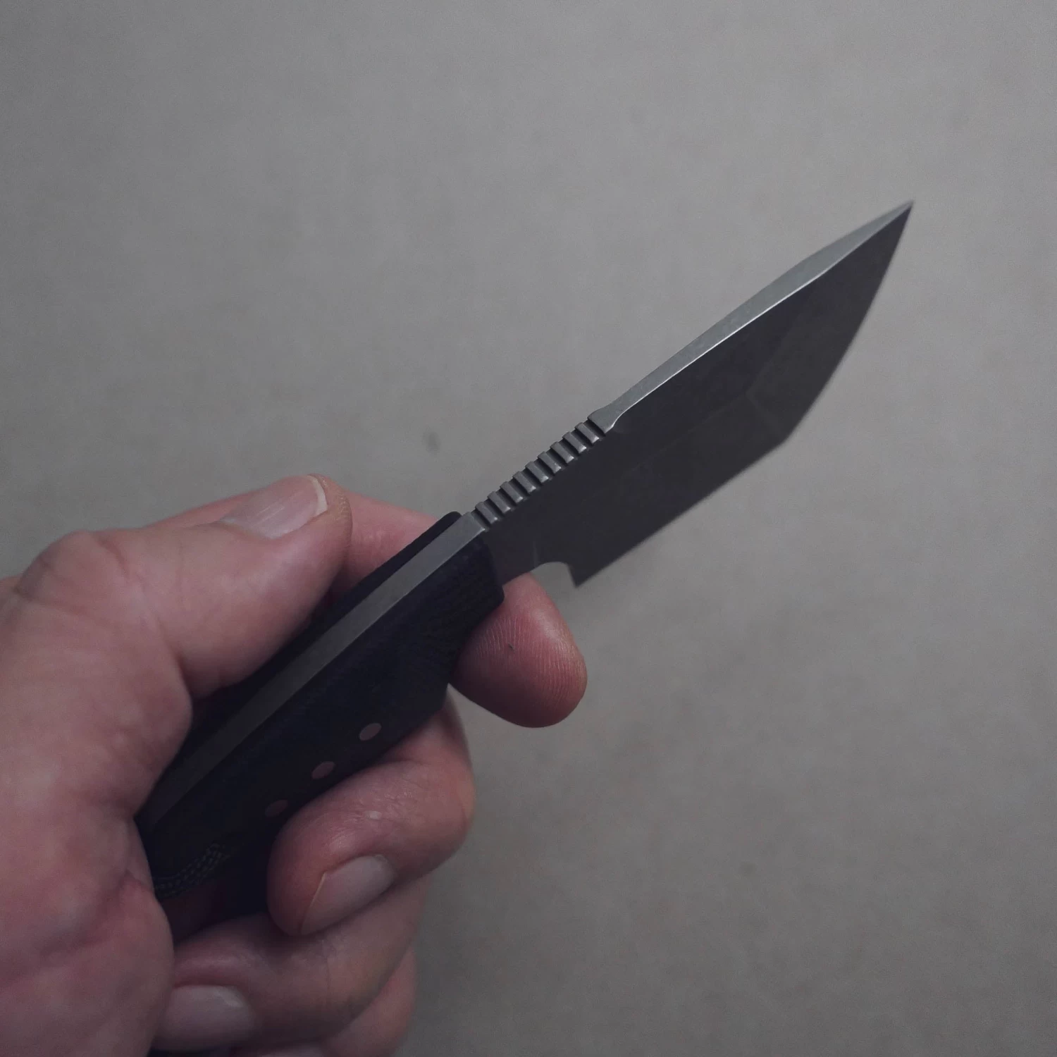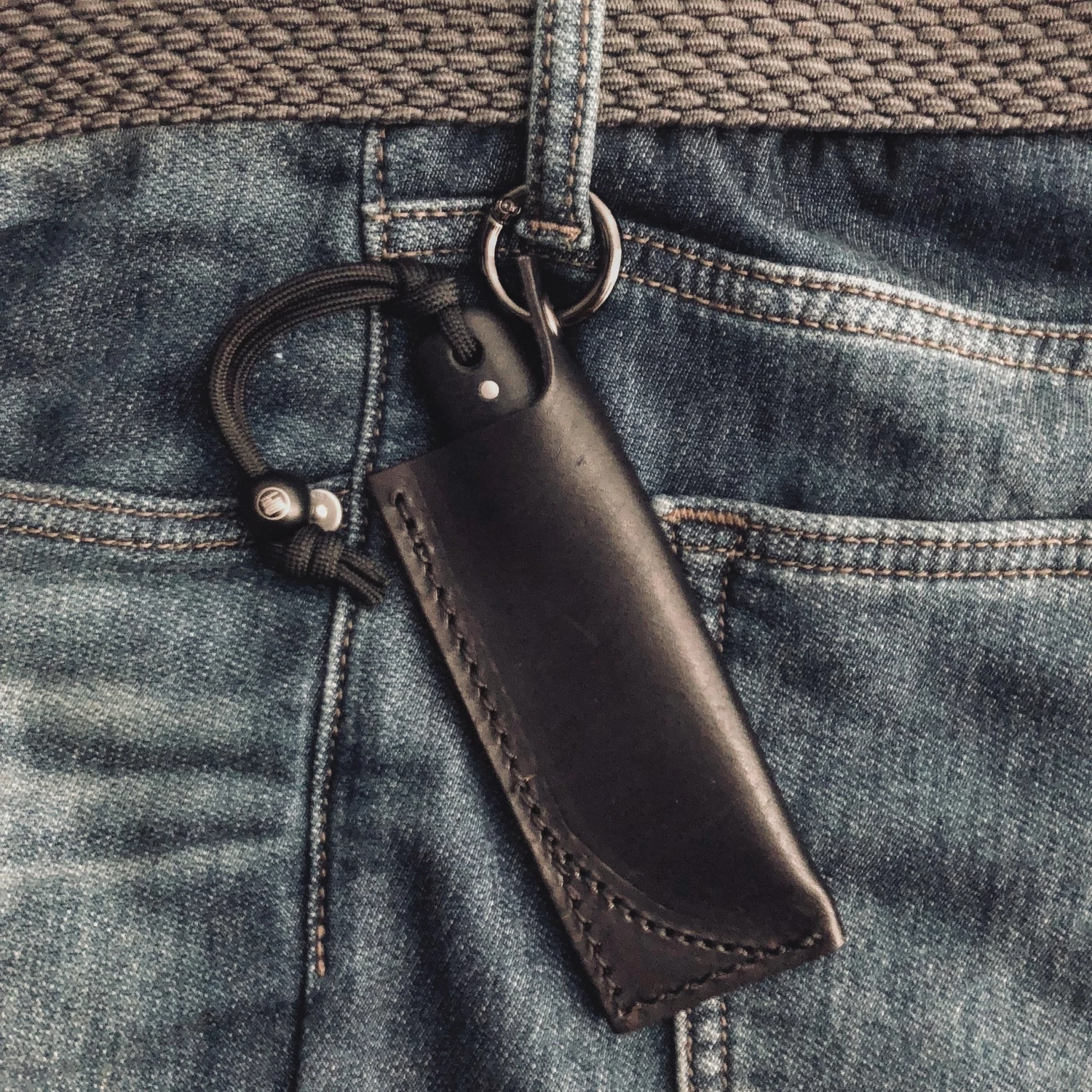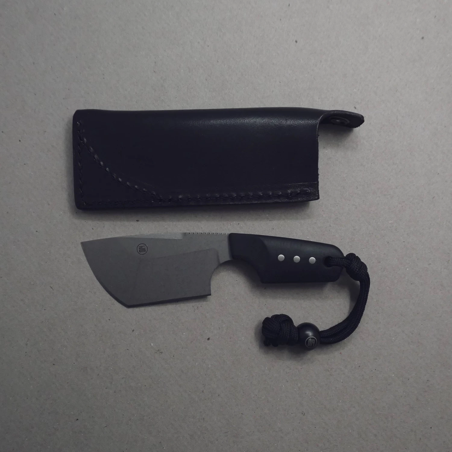 The Blanka is a fixed blade pocket knife with a very secure and comfortable grip that offers lot of control. The profile is unique – a cross between tanto and cleaver, designed to give it more cutting edge. It may be small but it will fulfill most of your cutting needs. Steel inlays in the G10 scales, full tang VG10 beadblast stonewashed blade. Comes with a full leather sheath, paracord lanyard and steel bead.