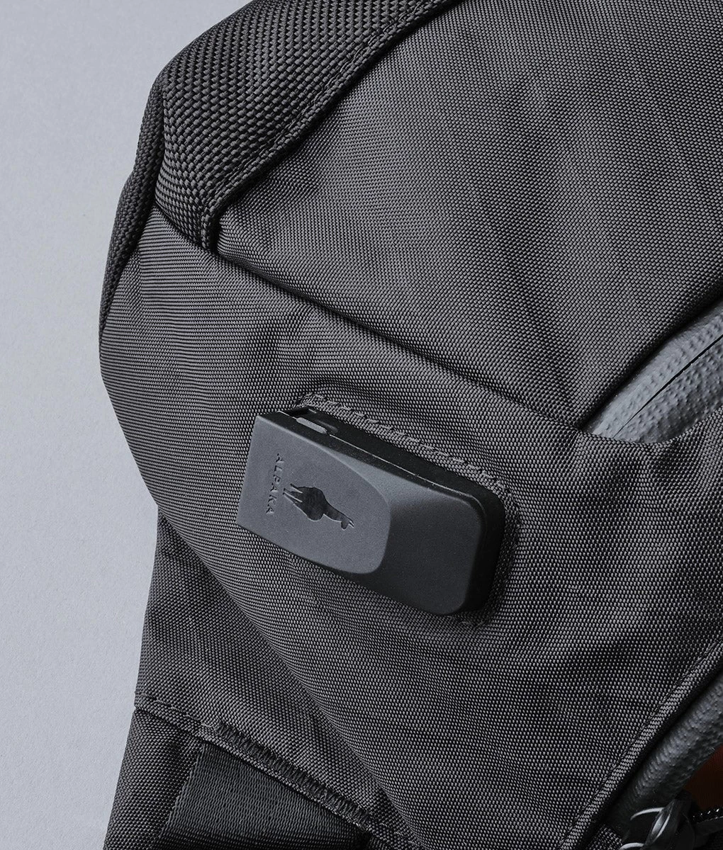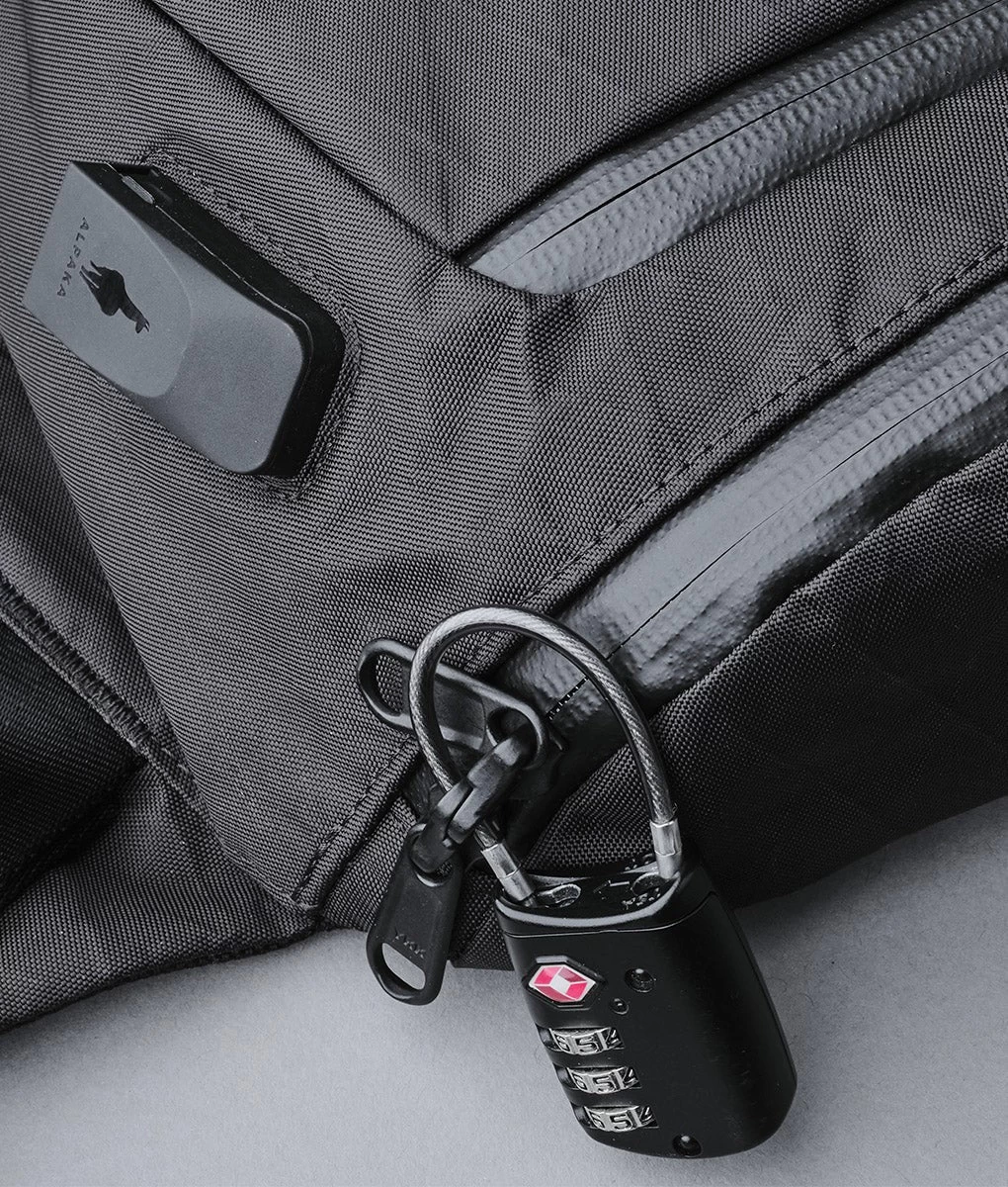 The strap buckle and integrated key tehter have magnetic locks for easy handling. RFID protected rear pocket and lockable zippers for extra security.