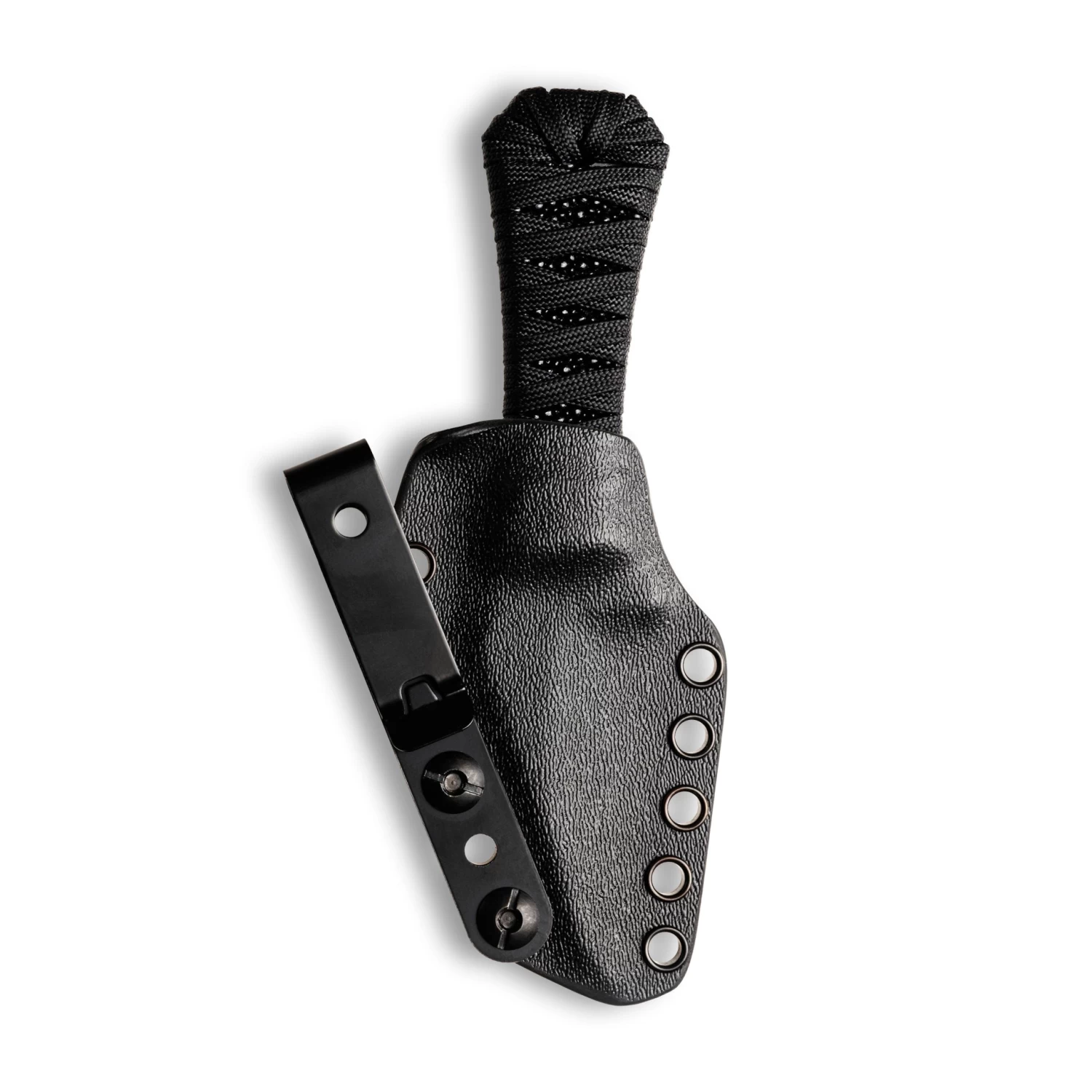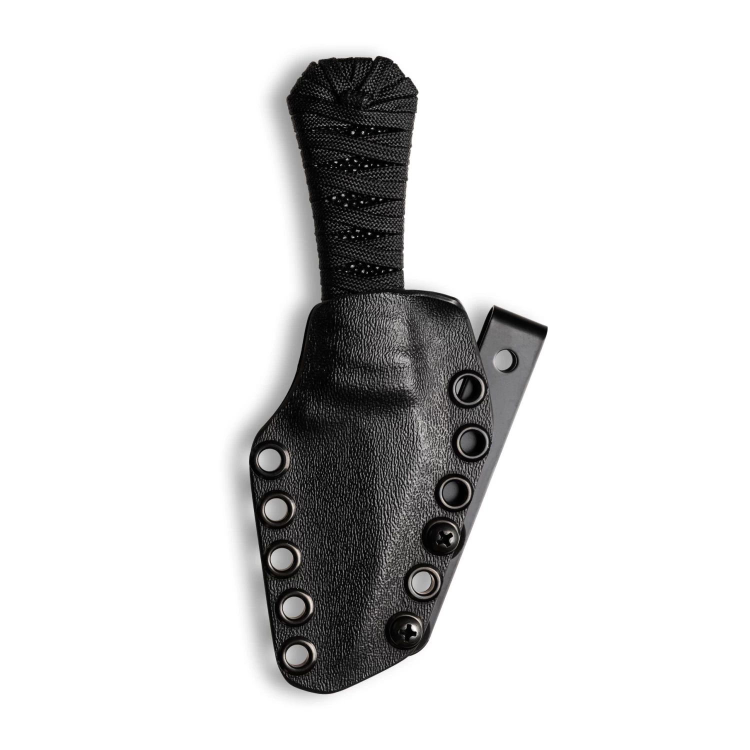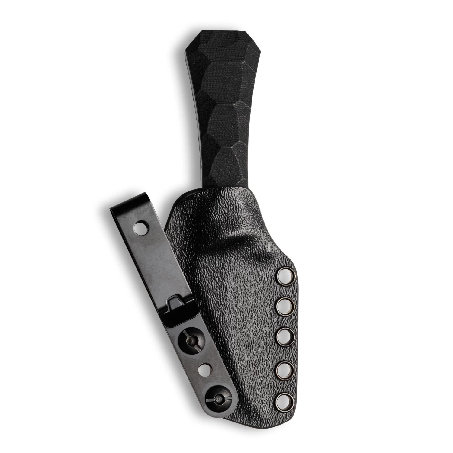 Aux Mfg expanded on the success of the Pocket Bowie release by adding 4 new blade shapes to the Coffin handle. Includes custom Boltaron sheath with reversible metal belt clip.