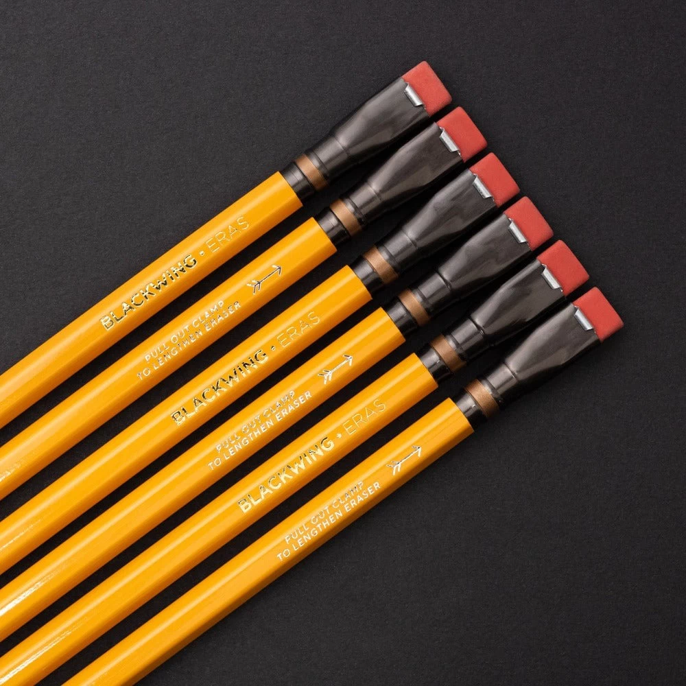 The Blackwing Eras (2023 Edition) pencil sports a retro design inspired by the Van Dyke 601. Each box includes 12 special edition pencils with a yellow barrel, dark grey ferrule with a gold band, a red eraser, our firm graphite, and a “PULL OUT CLAMP TO LENGTHEN ERASER” imprint.
