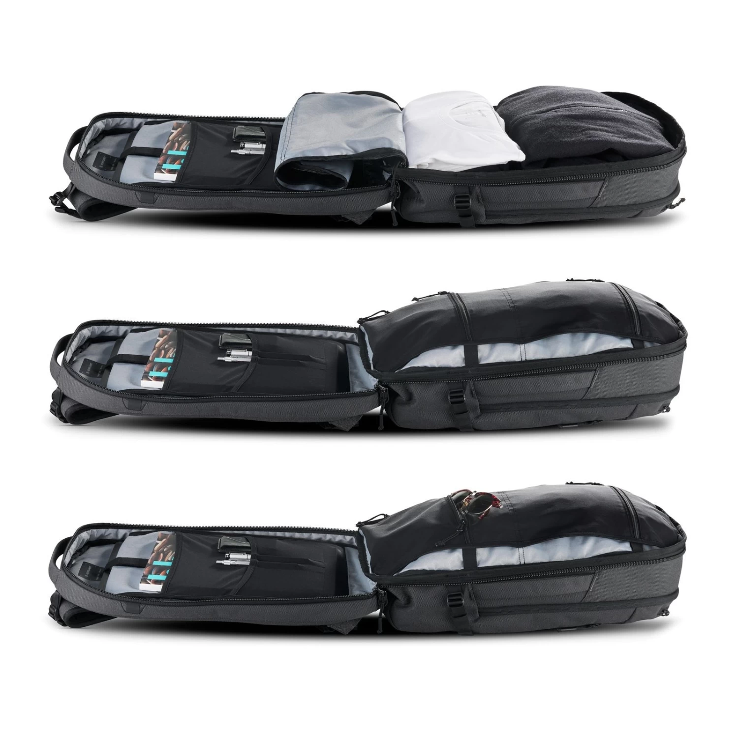 The clamshell opening allows the bag to be completely open when laid down flat, which makes it easy to pack your stuff. Laptop slot, several smaller and larger stretch pockets and fleece lined compartment for iPad organize everything in the inside. The rear compartment is accessed through a water resistant zipper. The exterior offers two large zipper pockets for small items, one at the top and another one that opens through a vertical zipper