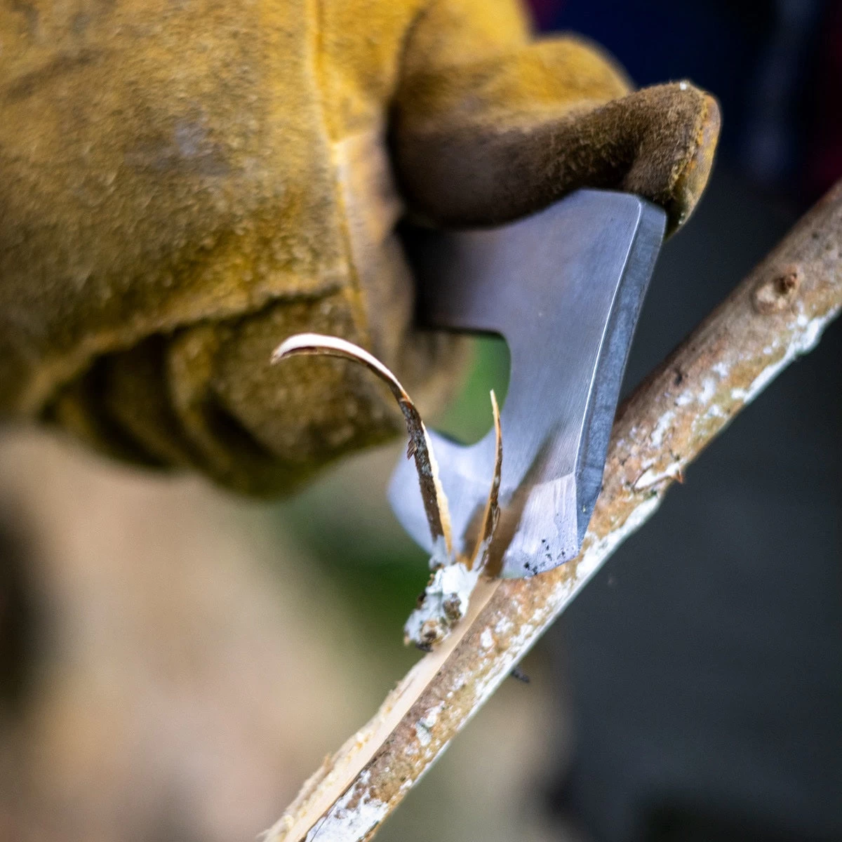 The Jack Axe is made using quality high Carbon BS 4659 Tool steel designed to be able to hold a sharp edge while taking a beating. The finger hole behind the blade gives added control for whittling, sharpening and accurate cutting projects. At 5 mm thick, its thicker than your normal blade, resulting a effective small branch splitter using the battening method.