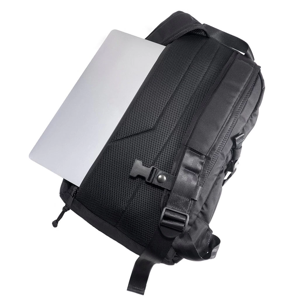 The primary laptop sleeve in the main interior fits a 16″ notebook computer and is elevated + padded for enhanced protection. Auxiliary back-facing compartment comfortably holds a 14″ laptop (and up to a slim 16″ such as the 2021 Macbook Pro), with an internal mesh pocket large enough to fit a 10″ tablet for convenient access. The compartment is hidden when the bag is worn for added safeguarding.