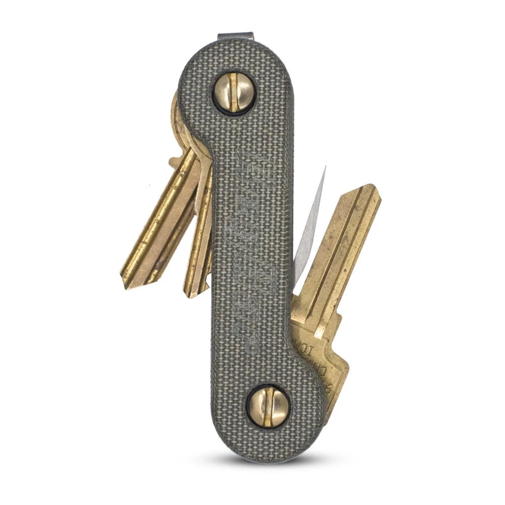 The KeyBar Micarta is a key organizer that works like a multi-tool for your keys and other everyday carry items. Just load your keys in and organize them how you want, and your keys stay put in a neat package without rattling sound or poking in the pocket. To use a key, simply turn it out from the KeyBar. The titanium pocket clip allows easy attachment to the pocket, belt or bag.