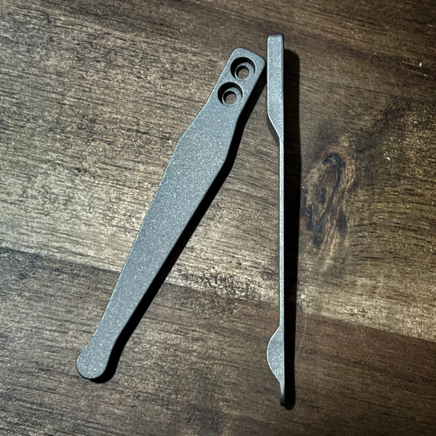 A milled titanium clip for Micro Click flashlight in stonewashed finish. The existing screws work with this clip.