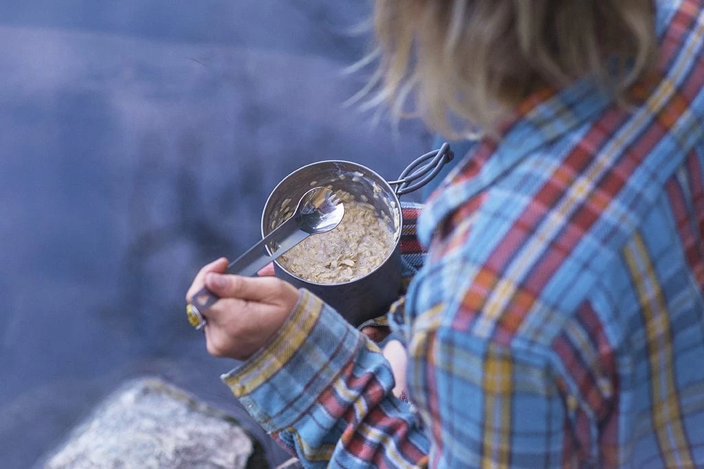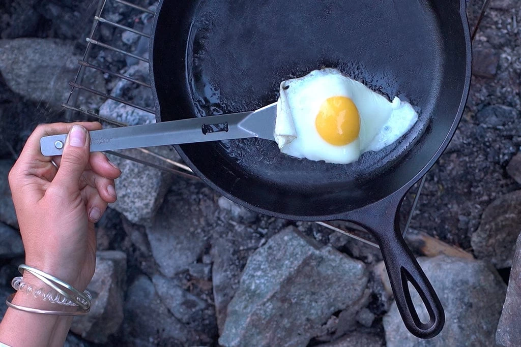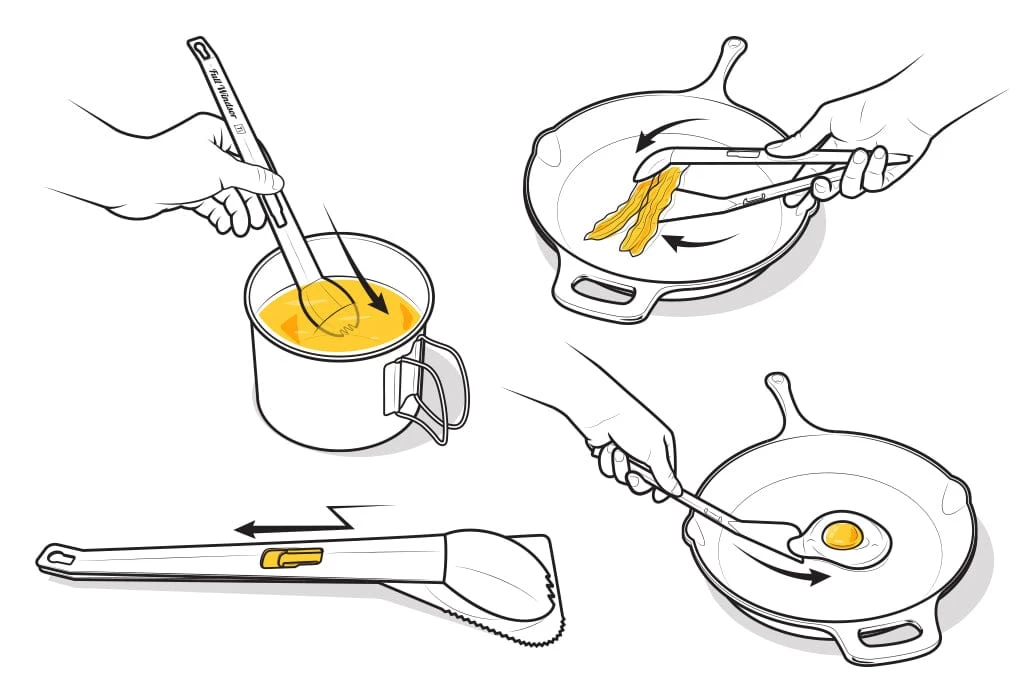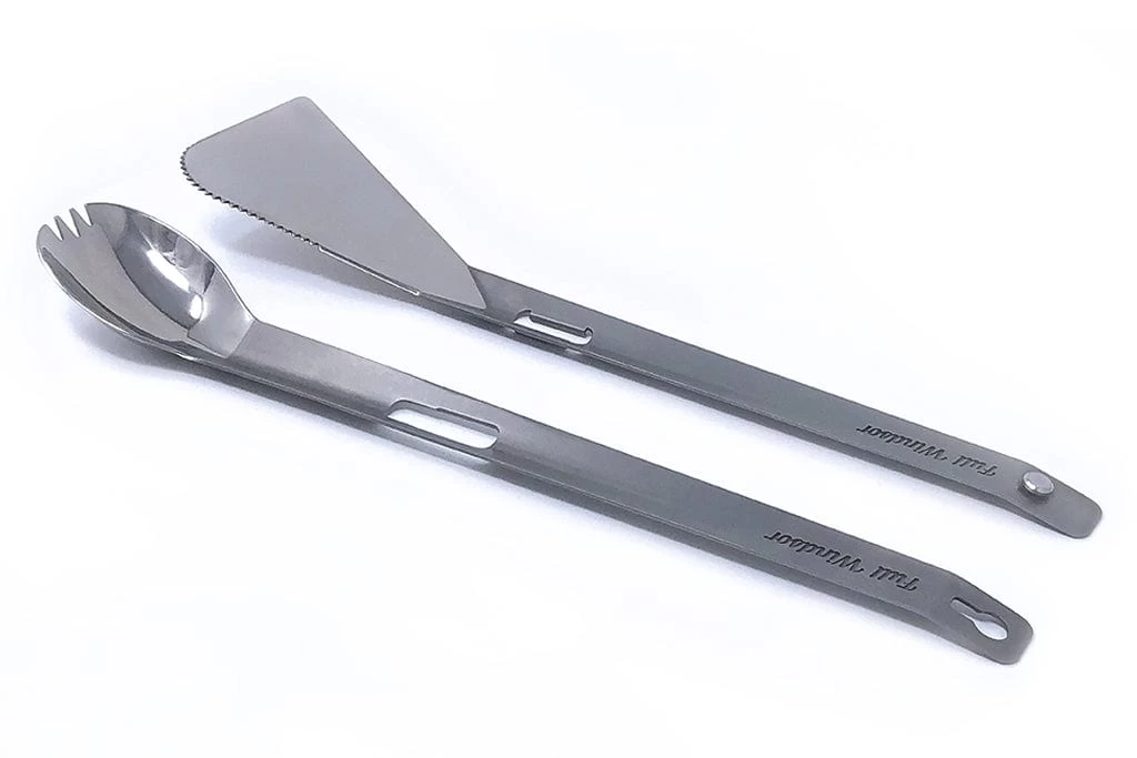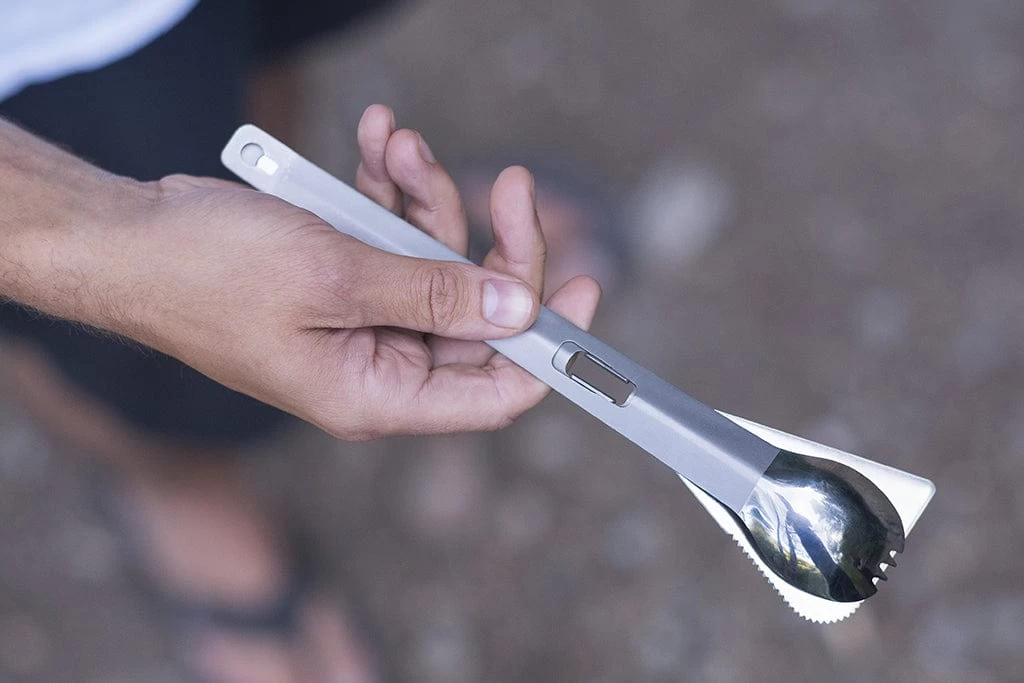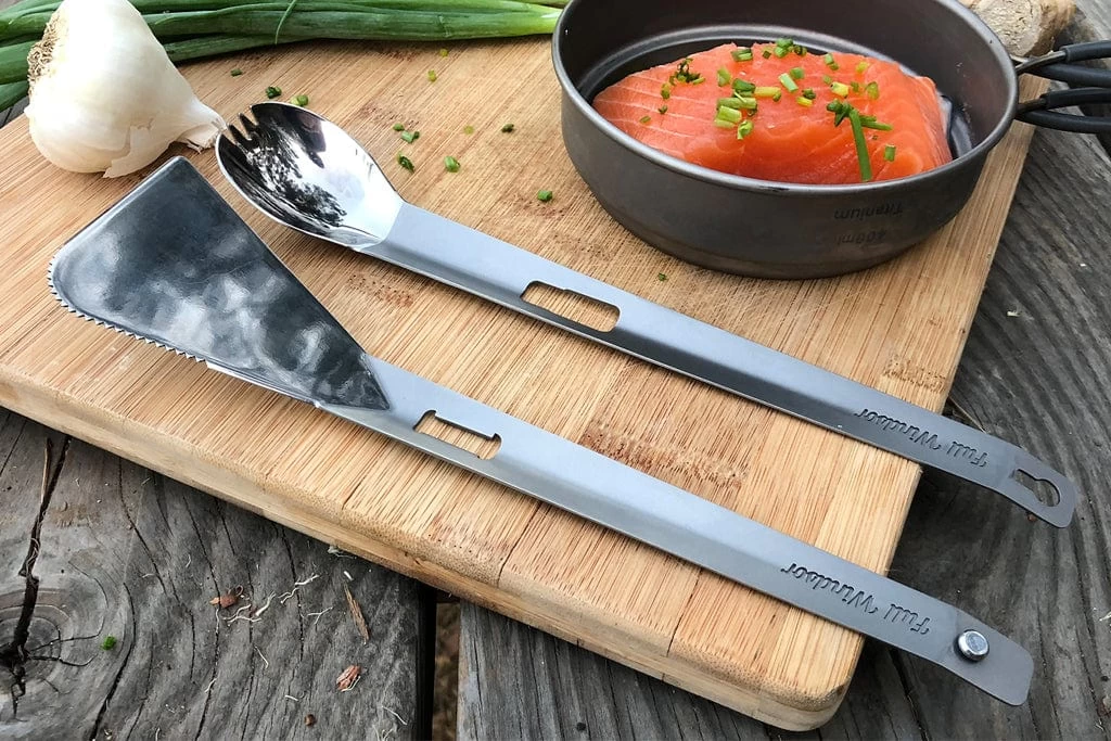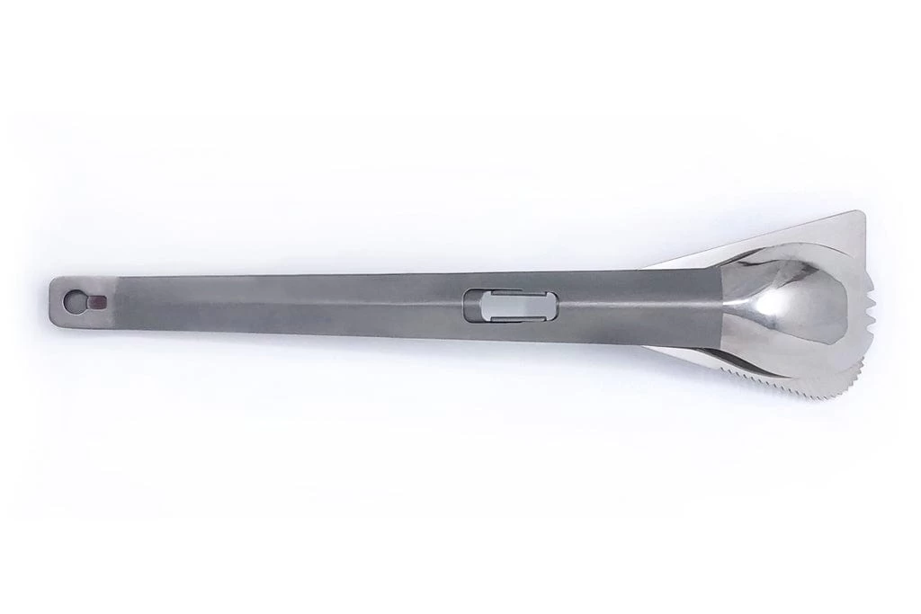 Both the spatula and spork make perfectly useful outdoor cooking utensils on their own as well. The spatula features a chamfered edge for easy scooping, as well as a serrated corner for cutting into and checking on food while it is still cooking. The long spork is perfect for getting into deep food packets and can be used as both an eating and serving utensil.