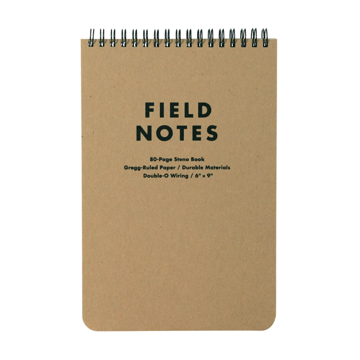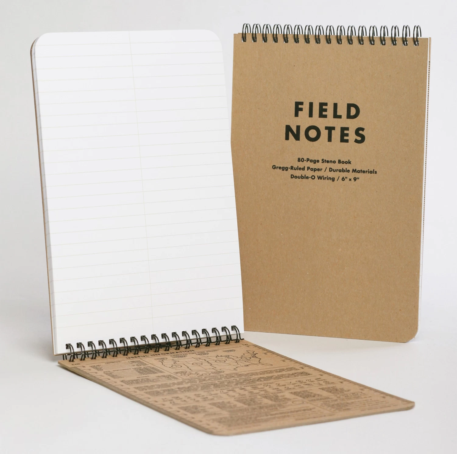 The Steno Book is good sized memo book, which always lies flat thanks to its black Double-O Wiring spiral at the top. Inside sports 80 pages of “Bright White” paper, Gregg-ruled with a fine, soy-based application of light brown ink. The inside covers provide a range of useful information from the history of stenography and an abbreviations guide, to temperature conversions, planetary distances from the sun.