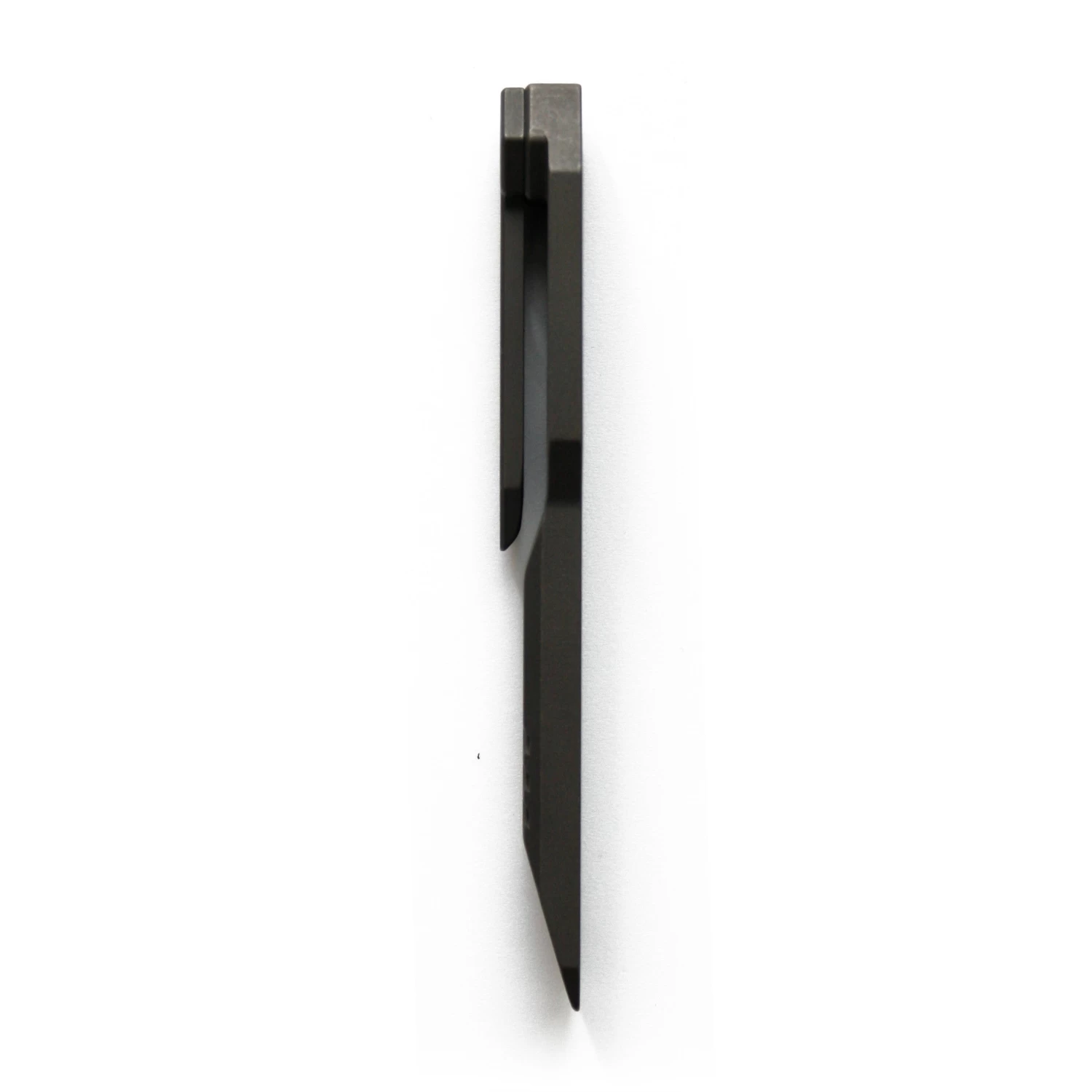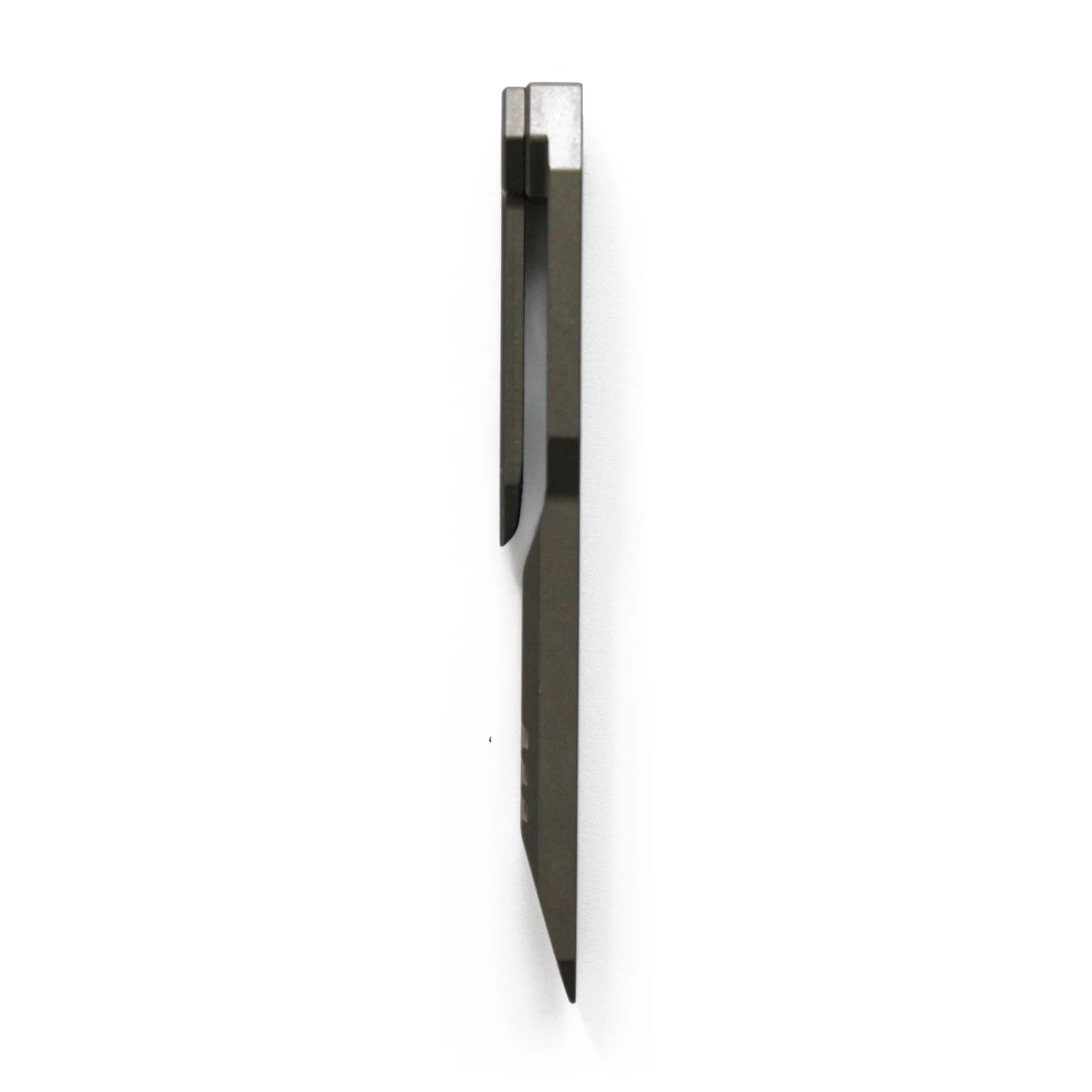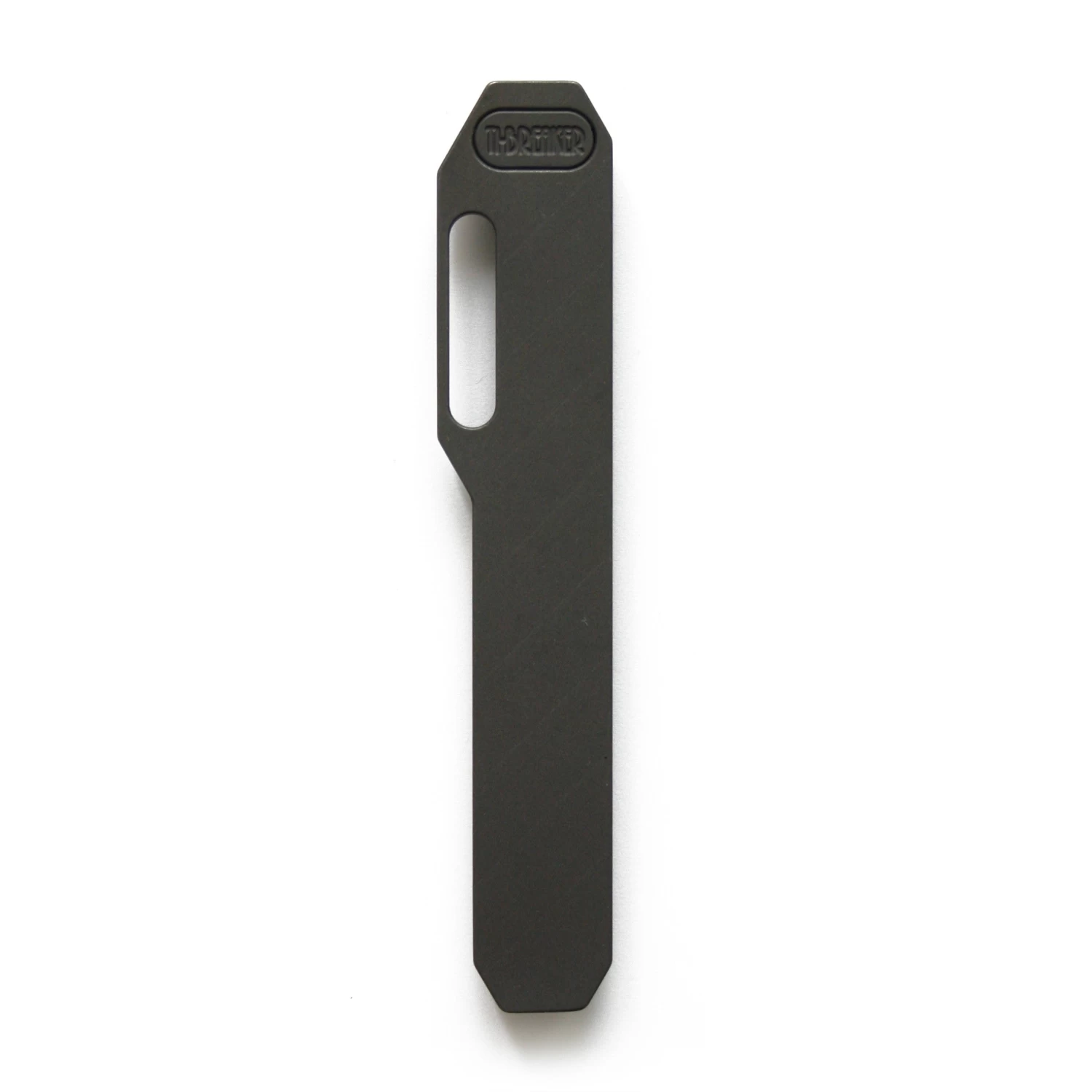 The tool is made from Grade 5 Titanium (6AL4V). Titanium was chosen due to its durability, lightness, and high corrosion resistance. It is bead blasted and stone washed to give it a nice finish that is cool to the touch and wears gracefully with age.