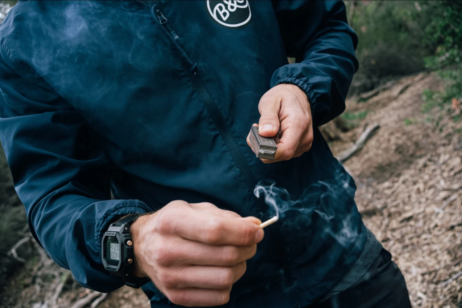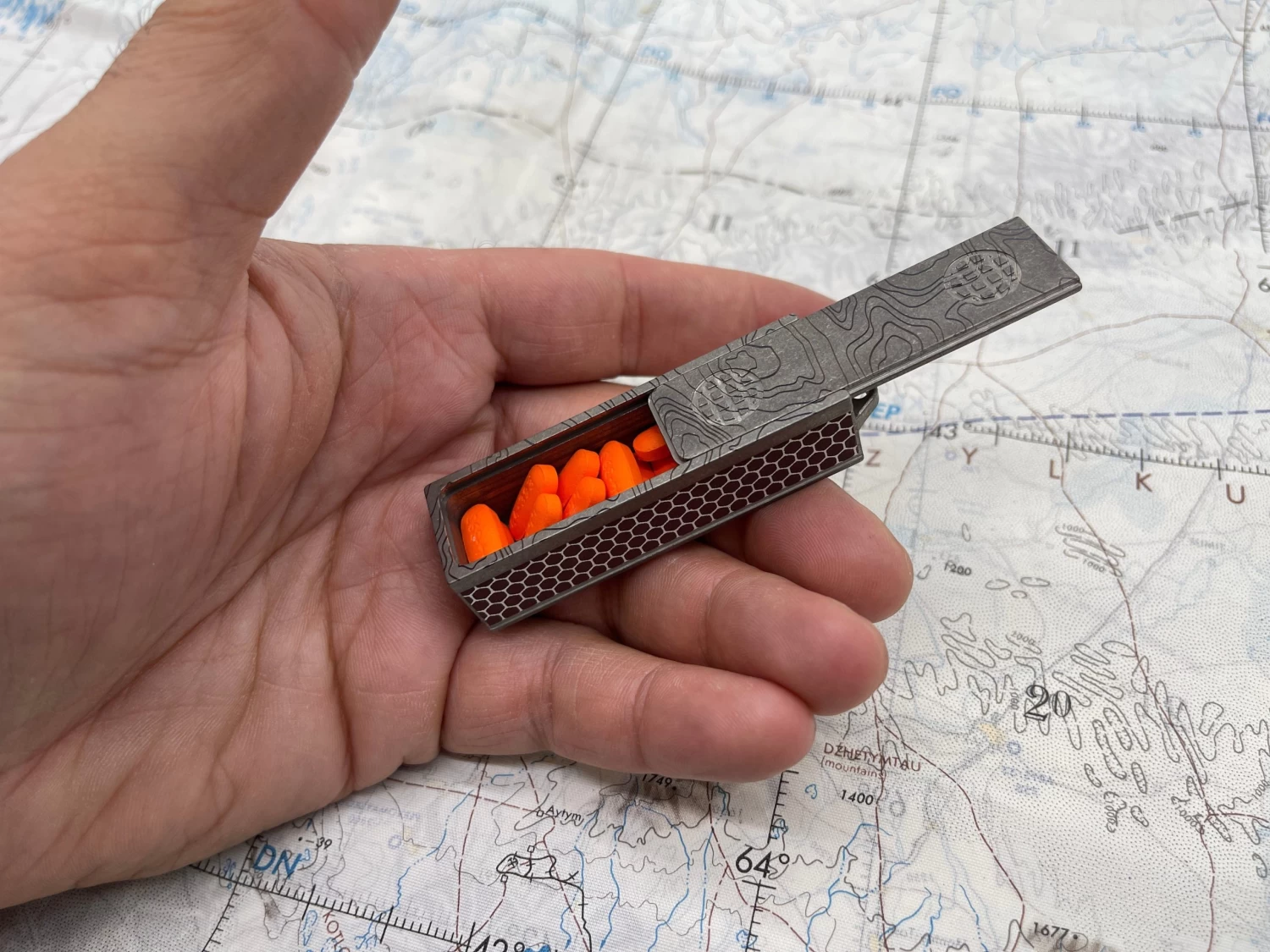 The Titanium Match Slide Box includes a looped top for easily carrying this unique strong box on your key chain, neck, or even just adding a small lanyard to easily pull it out of your pocket. It has a spring-loaded plunger securing the machined top. The top has been laser engraved with a topographical map pattern.