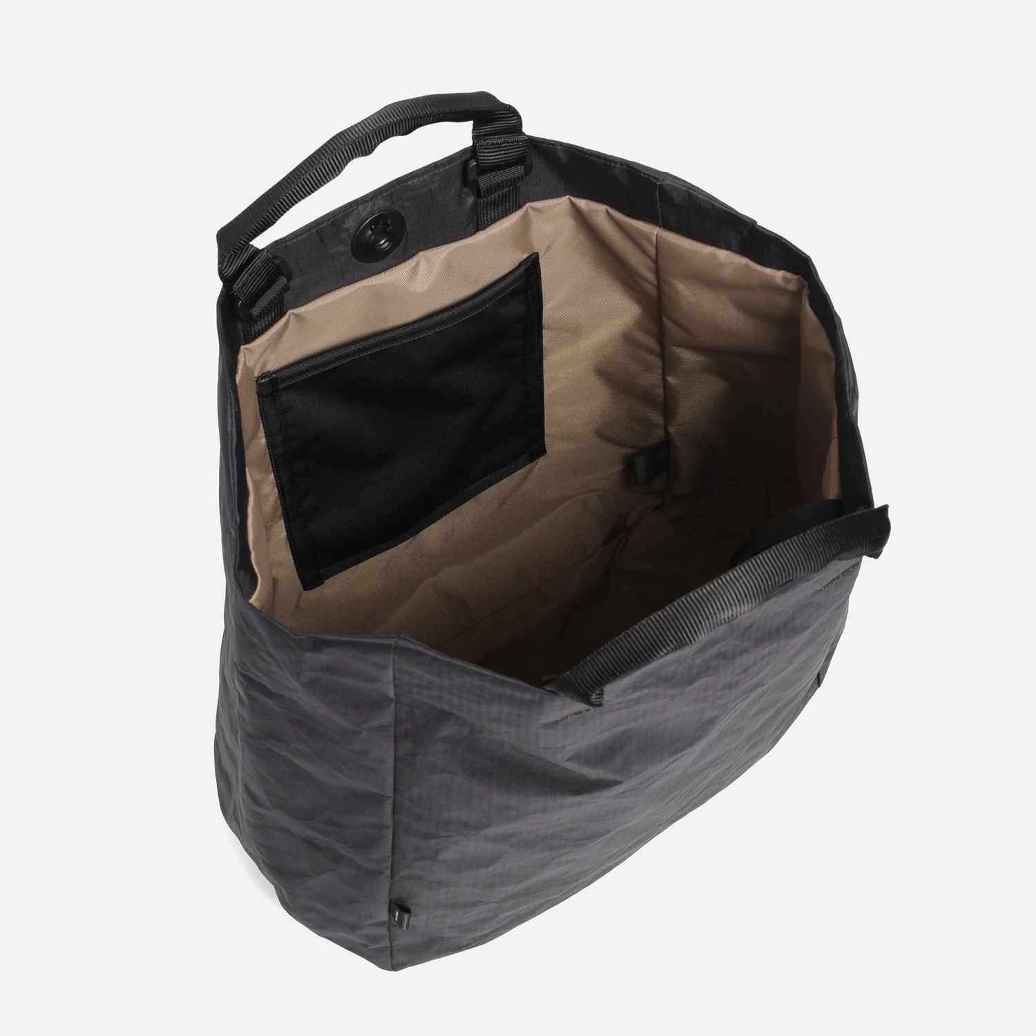 Stretch fabric sleeve and gated plastic clip in the inside of the bag to hold smaller essential items. Fidlock Snap closure for structure and easy access.