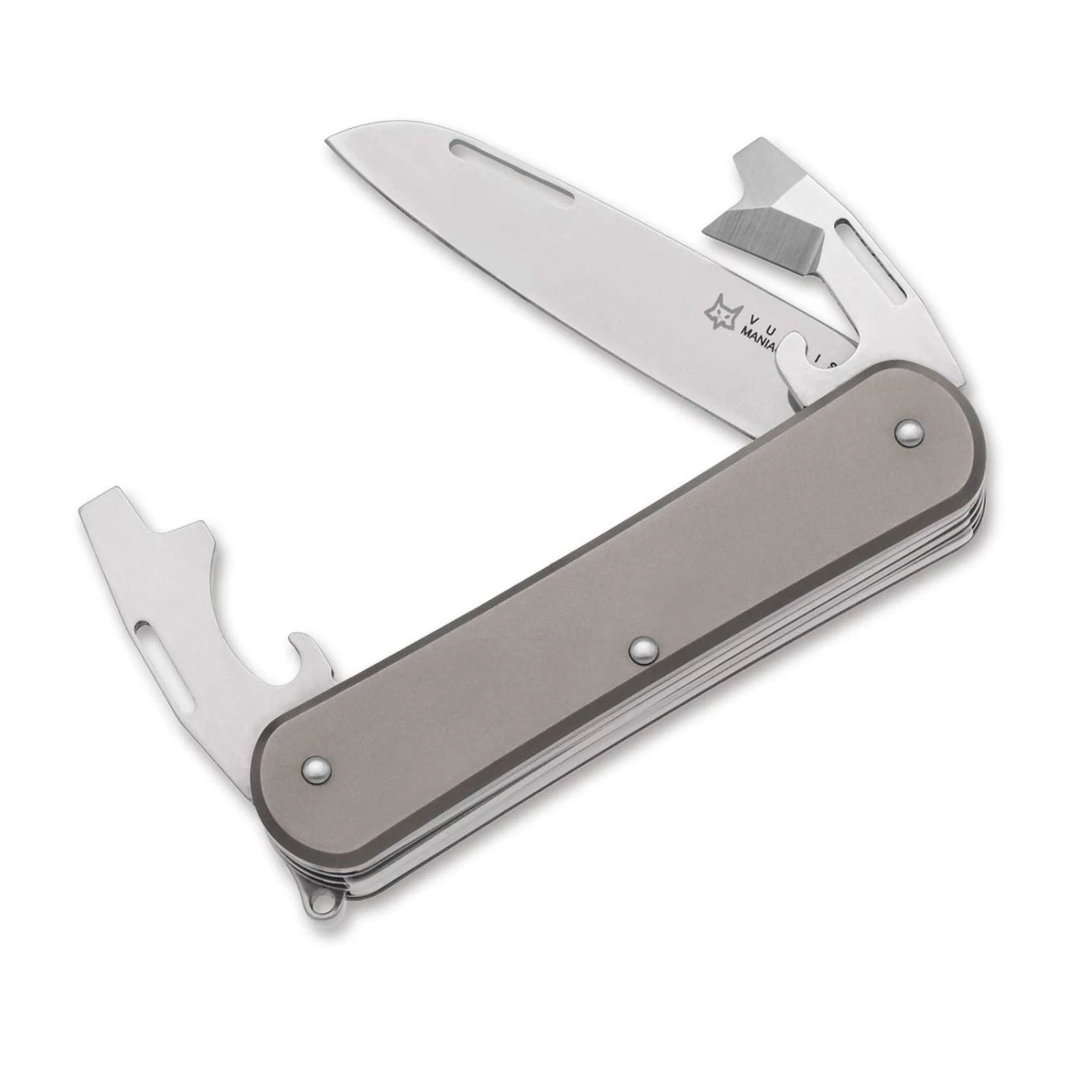 The Vulpis Titanium is a series of premium multi-tools with M390 blade steel and titanium scales. The Vulpis 3 includes a blade, bottle & can openers, and flatheads. The blade is a non-locking slipjoint with a nail nick opener.